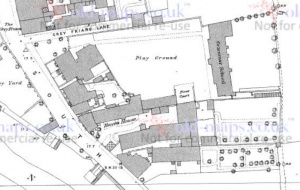 [[File:1888OSMap.jpg|left|thumb|1888 plan of BGS showing the location of the first Fives Court]] | |||